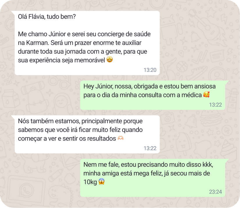 Uma conversa de verdade com um médico especialista da Karman, onde você é ouvido sem pressa. É aqui que seu diagnóstico é fechado e seu protocolo de emagrecimento e saúde é validado com ética e segurança máxima.